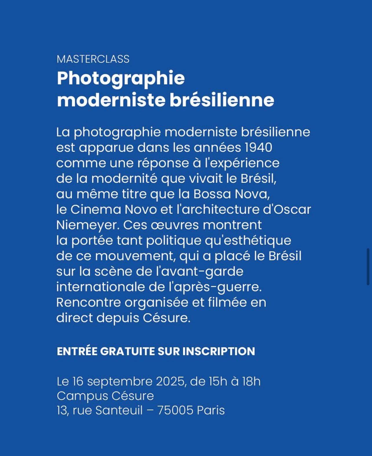 MASTERCLASS — La photographie moderniste brésilienne est apparue dans les années 1940 comme une réponse à l’expérience de la modernité que vivait le Brésil, au même titre que la Bossa Nova, le Cinema Novo et l’architecture d’Oscar Niemeyer. Ces œuvres montrent la portée tant politique qu’esthétique de ce mouvement, qui a placé le Brésil sur la scène de l’avant-garde internationale de l’après-guerre.