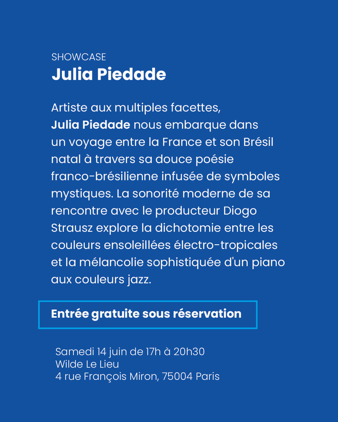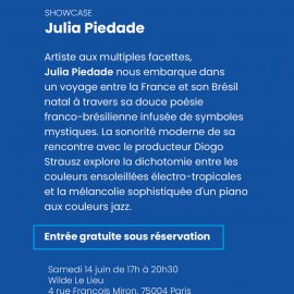 SHOWCASE – Artiste aux multiples facettes, Julia Piedade nous embarque dans un voyage entre la France et son Brésil natal à travers sa douce poésie franco-brésilienne infusée de symboles mystiques. La sonorité moderne de sa rencontre avec le producteur Diogo Strausz explore la dichotomie entre les couleurs ensoleillées électro-tropicales et la mélancolie sophistiquée d’un piano aux couleurs jazz.
