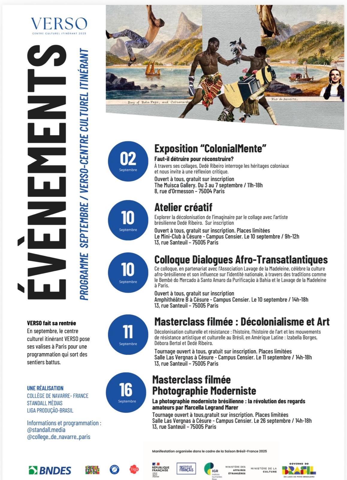 Uma aventura cultural franco-brasileira inédita imperdível, para descobrir a riqueza e a diversidade da cultura brasileira no coração de Paris, antes que ela atravesse o Atlântico. Após a circulação de eventos culturais em lugares emblemáticos na capital francesa, VERSO irá desembarcar no Brasil: em Porto Alegre, São Paulo e Rio de Janeiro. Todos os eventos são gratuitos mediante inscrição.