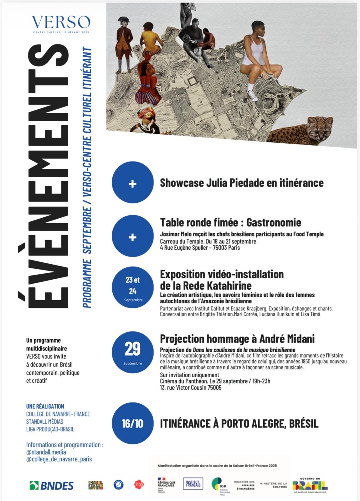 Os 30 eventos programados de abril à outubro, fazem parte da programação oficial da Temporada Brasil na França, contam com o apoio do BNDES – Banco Nacional de Desenvolvimento Econômico e Social do Brasile com inúmeras parcerias: a USP (Universidade de São Paulo), o GLIP – The Global Institute for Peace and Conflict Resolution, a Université de Rennes 2, a Université Sorbonne Nouvelle (Centro de pesquisas sobre os países lusófonos/CREPAL), o Instituto de Pesquisa e Desenvolvimento (IRD/PALOC), MNHN, Collège de Navarre Éditions et Médias, VERSO Centro Cultural Itinerante Paris 2025, Instituto Catitu, Rede Katahirine, o Espace Krajcberg, Plateau Urbain, Césure, Espace Wilde- le lieu, Embaixada do Brasil, CHC – Santa Casa, ABL – Academia Brasileira de Letras, Paris Arty, La Quincave, Standall Media.